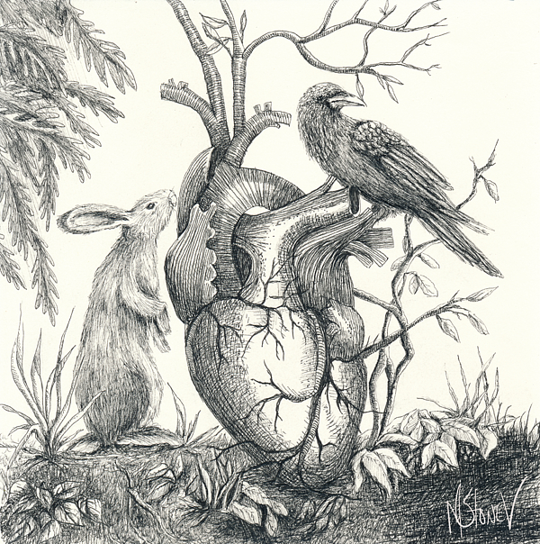 A rabbit and crow create a healing heart